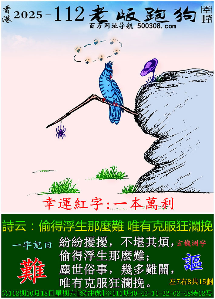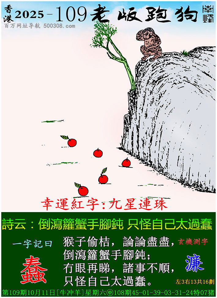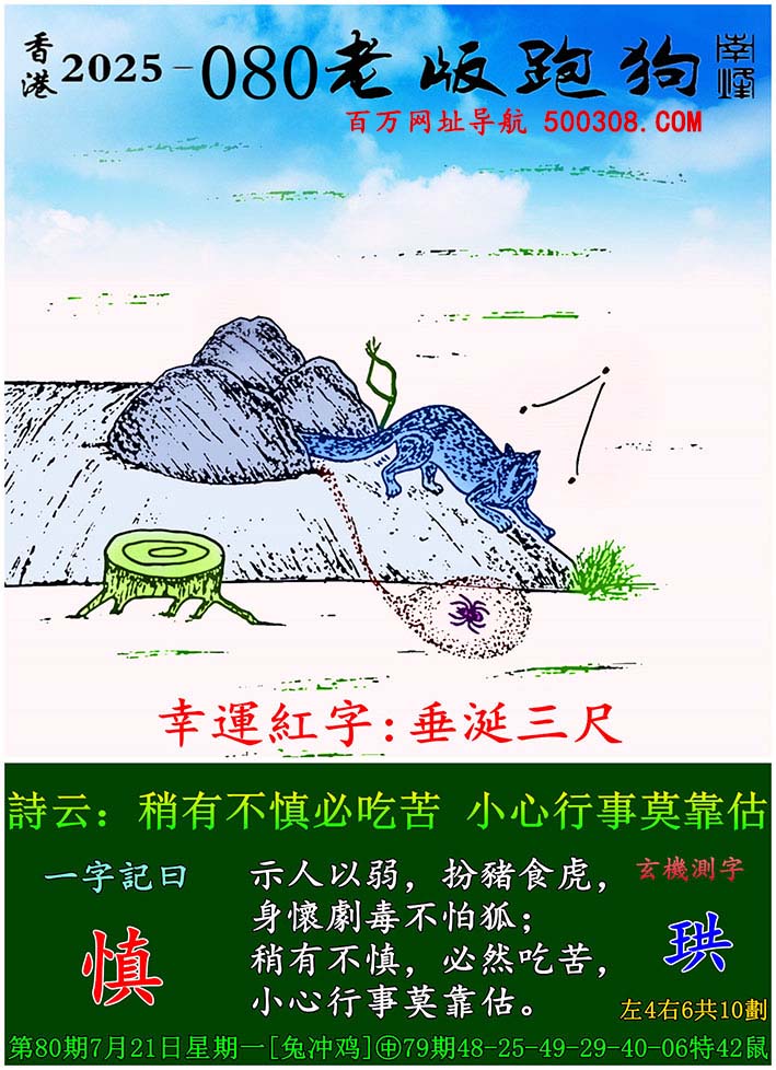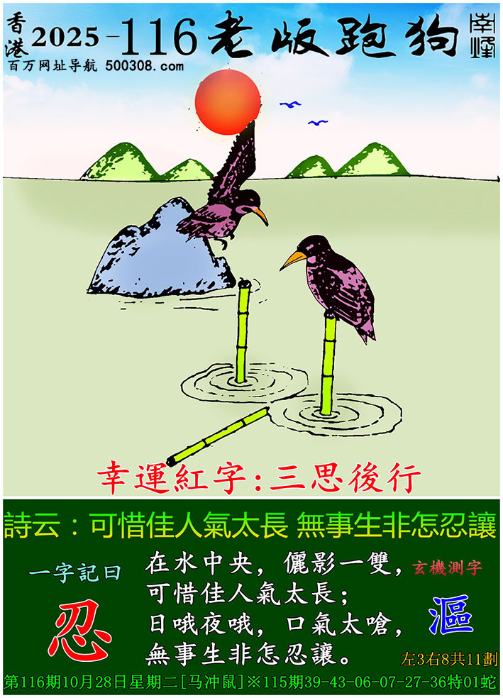 121期跑狗图:一字記之曰:【蟲】 立足水濱,身影疏朗。 長喙疾出,蟲影難藏。玄機測字:《綿》 一語中特:二八佳人