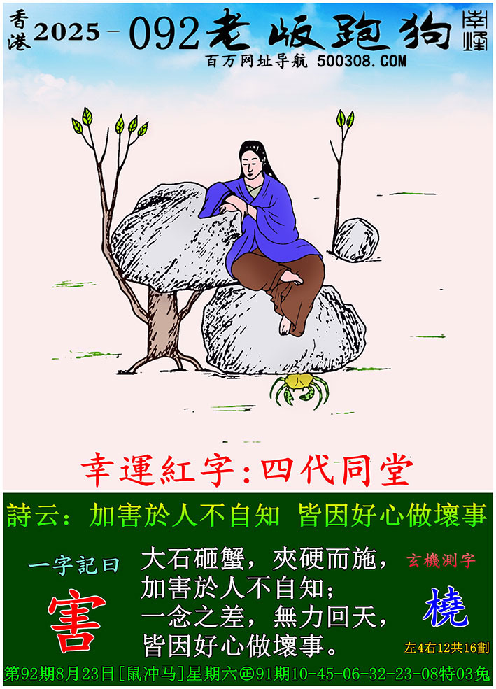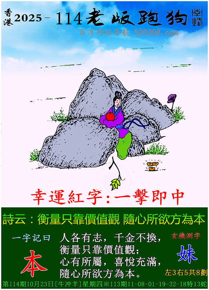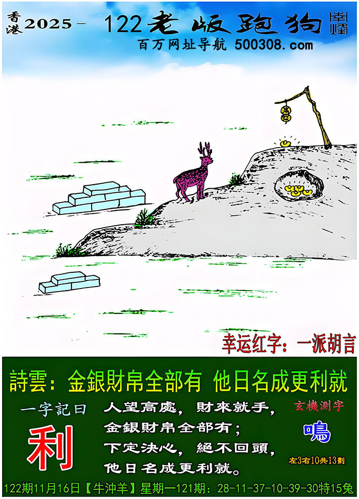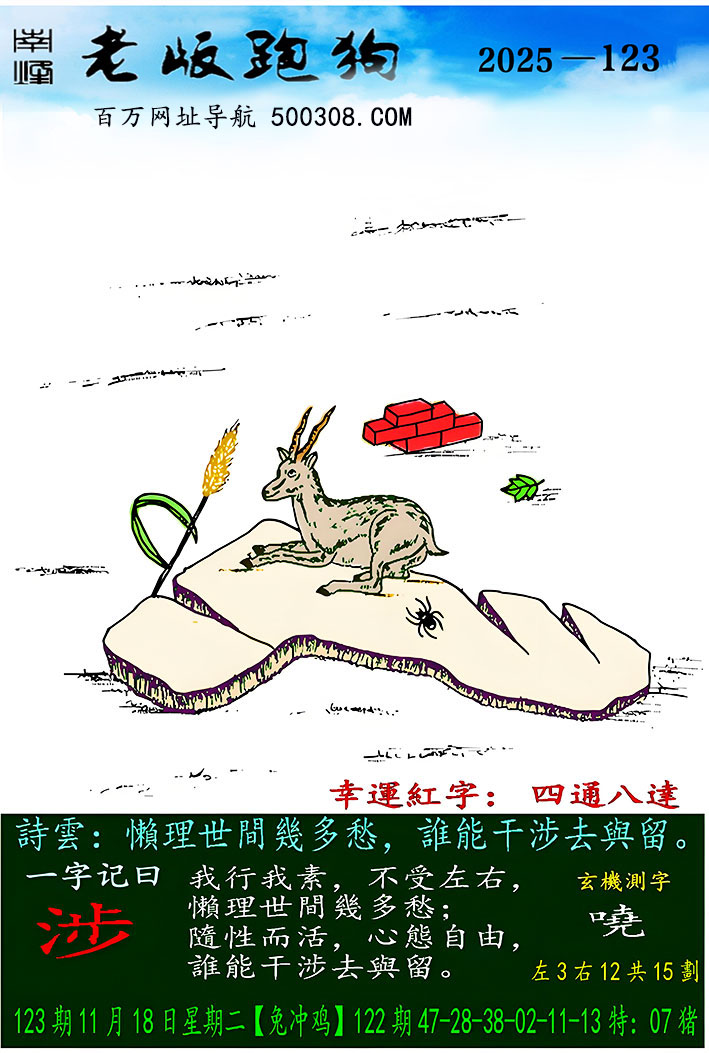 123期跑狗图:一字記之曰:【躲】 屏氣凝神,躲於石陰。 聞聲不語,笑等追尋。玄機測字:《戲》 一語中特:五花八門
